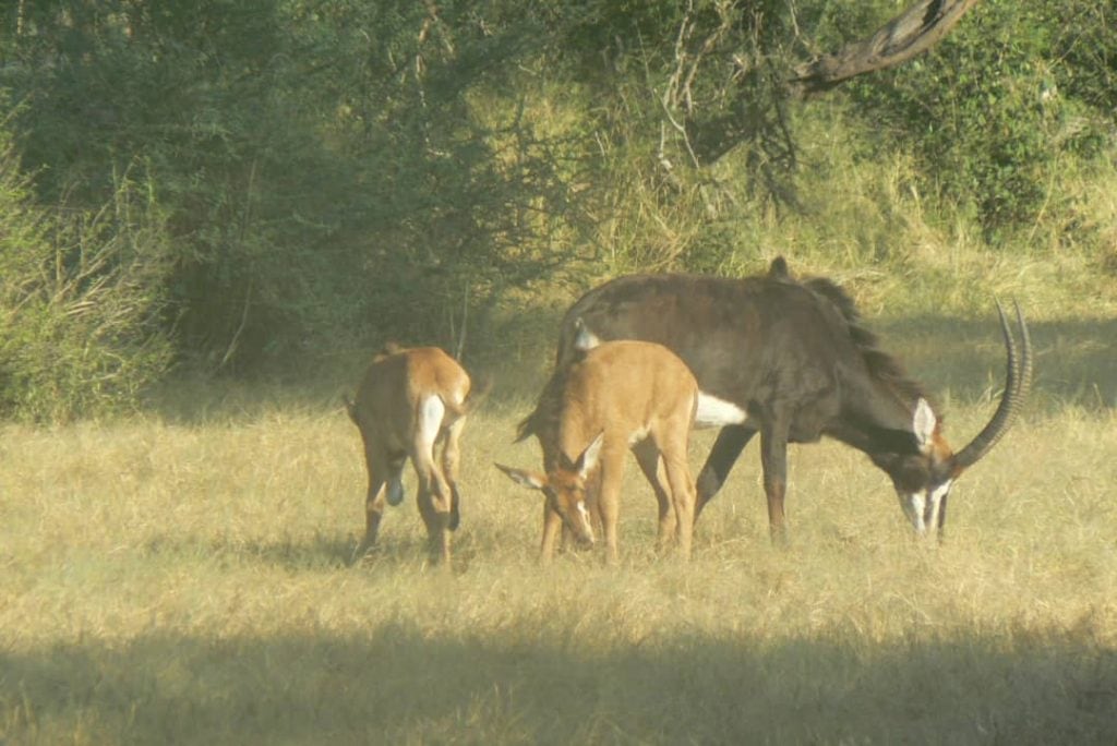 During April, our guides took longer drives (often full days or full nights), and were therefore able to spent more time in the very south of the property, around the southern pans, Zanangubo, T-block, Zebra and Kusarai. It’s wonderful to see wildlife returning to this area, zebras, elephants, buffalos, evidence of eland activity, signs of leopard movement, lions hunting buffalo at T-block (hyenas around, of course), roan antelope on the southern boundary road, as well as by Kusarai pan. Notable, Roan are one of the nice Specially Protected Animals or Special Protected Species (SPS) in Zimbabwe (the list also included both the black and white rhino). Sable antelope (which are normally sighted in the south), were actually sighted with young(!) in the northern section of the property. (Images taken with a camera phone through binos – genius!)