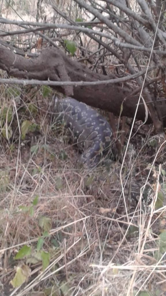 African Rock Python (python sebae natalensis) had a big meal that will keep it going until the next rain season, or another year from today, the day of its last meal. Now is ready for hibernation up to December. Its length is about 5 m. In Zimbabwe an African Rock Python is the only snake (or reptile) on the list of the Special Protected Species (SPS).
