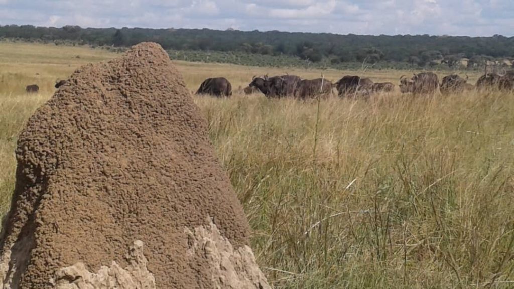 In addition to the dugga boys in the north of the property, large breeding herds of buffalo were sighted throughout the month across the property. Senior guide Ophious commented, “they all look so healthy”. “Buffs +100 on Kudu Alley and +200 @ Vlei “Buffalos @ Dec Pan (+300)” “Buffs (+++100) @ T-block.” [Despite these numbers (or maybe because of them), we only have a couple of photos of buffalo from the whole of April, including a rather artsy one, in which it looks like the photographer was hiding behind a termite mound.]