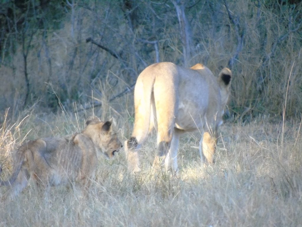 Lion activity continued to be a prominent feature through April. After a few days alone, the lion cubs joined the male lion and his large pride (11 in total). In the days prior a lioness was heard roaring in the distance, and there was evidence of a lioness traversing from the Eastern side of the property to the lodge. It’s possible that she’s part of this same pride. This large pride remained around the Kudu Alley area for some days, bonding with the cubs until they had had their fill of baboon meat and were ready to move. While there, the lionesses tried hunting zebra, with no success. The pride then made their way East and South to the more open vlei areas, following a very big herd of buffalo. Unsurprisingly, hyenas were in hot pursuit.