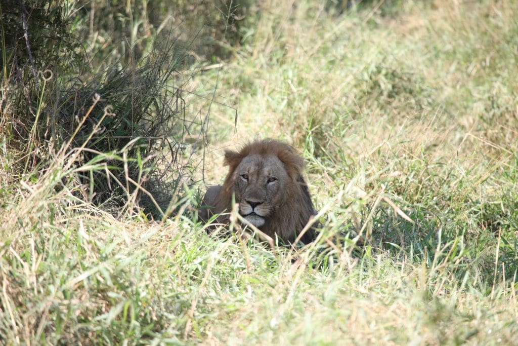 The next day, a large male lion came into the area. Evidence from tracks showed the lion stalking the injured buffalo, and a number of hyenas following close behind. It wasn’t surprising then, that the dark maned lion was found on a buffalo kill the very next day on Namakana Road. This is not far from camp, close to Kudu Alley, an area that is much loved by giraffes, which are regularly seen there and throughout the vlei systems.