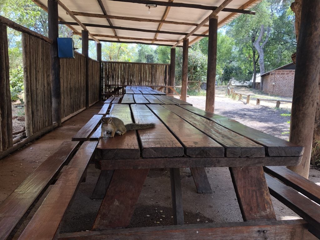 A wild tree squirrel looks to make friends in a quieter-than-usual canteen area.